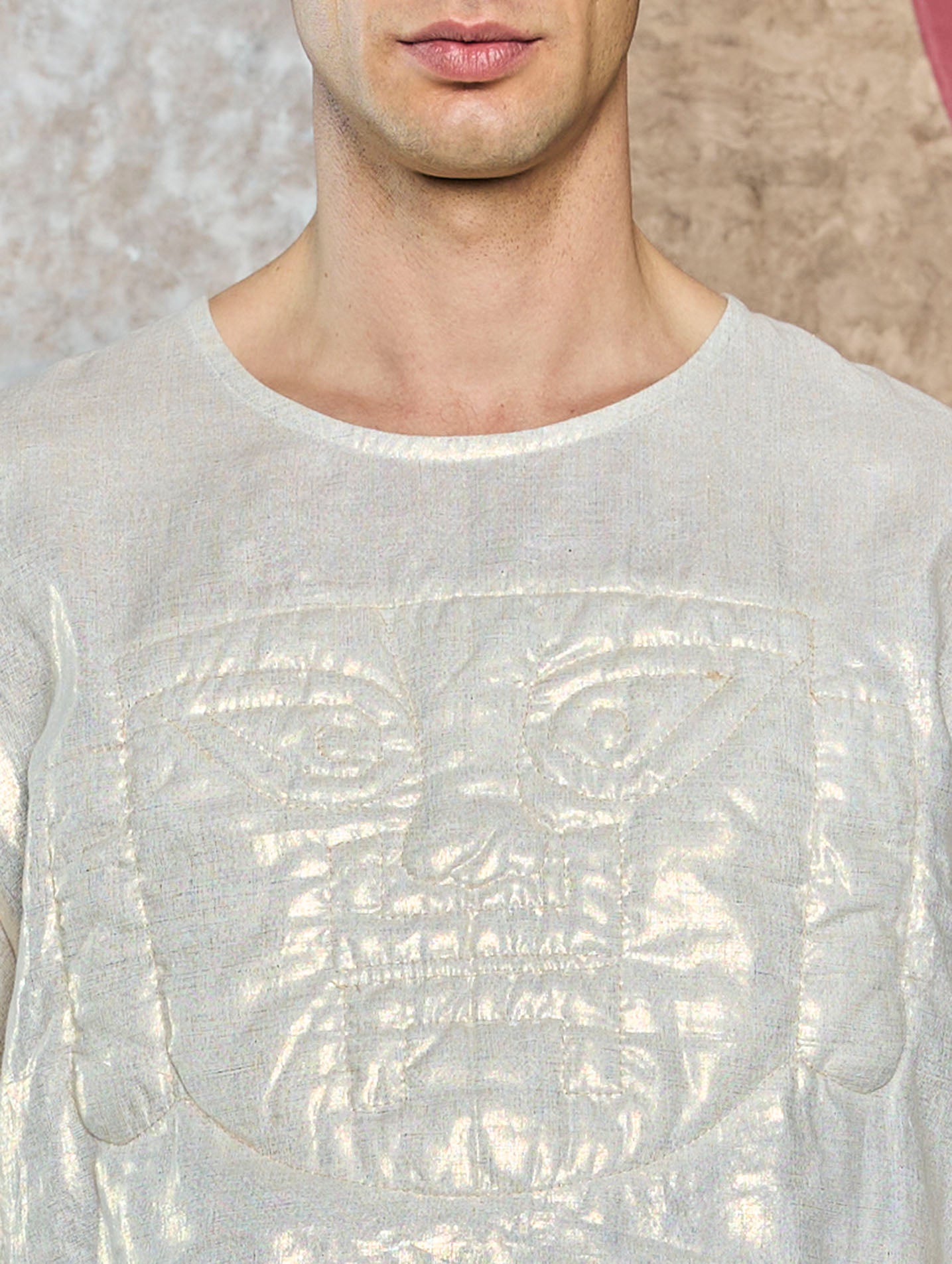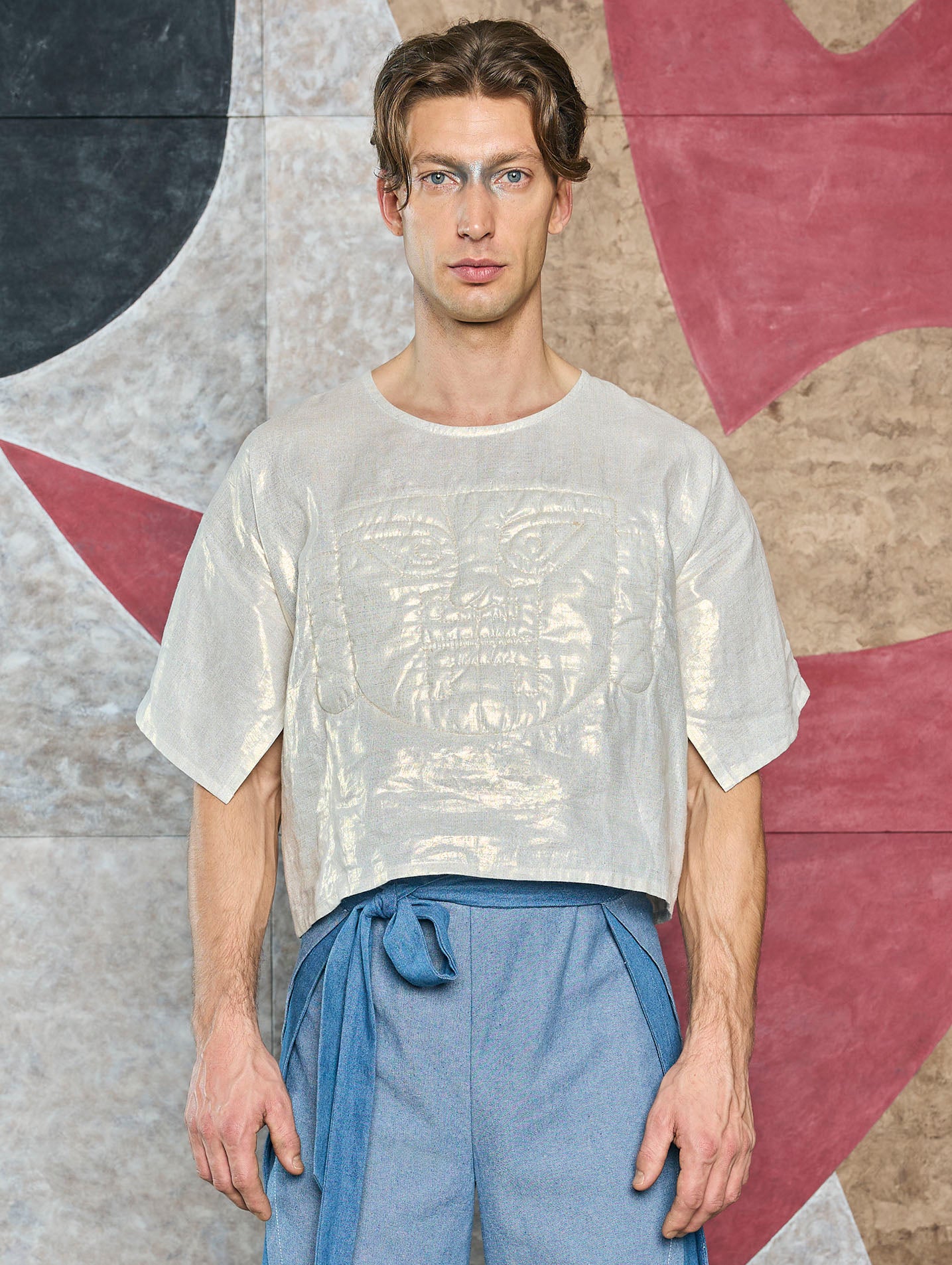 Elegant top with a straight hem and a round neckline. Featuring stylish 3/4-length sleeves, it is also designed with an original pre-Hispanic mask on the front.