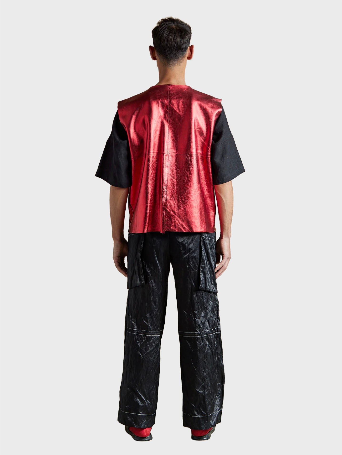 Vest stylized on the front with large square pockets and a shoulder strap. The design is complemented with a zipper and a cover with two buttons.