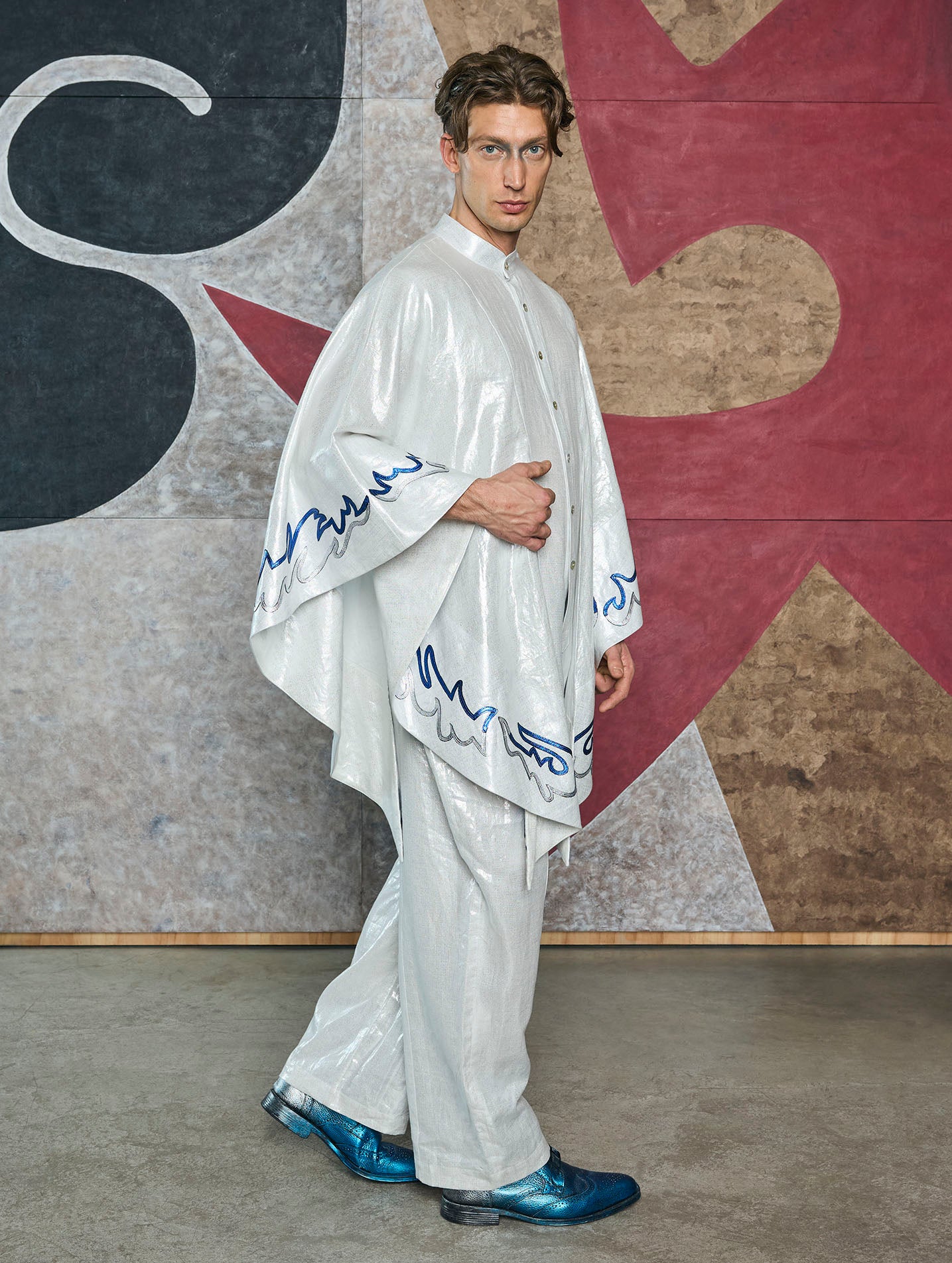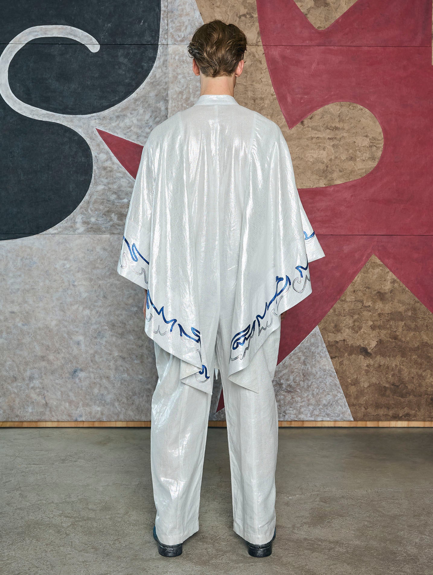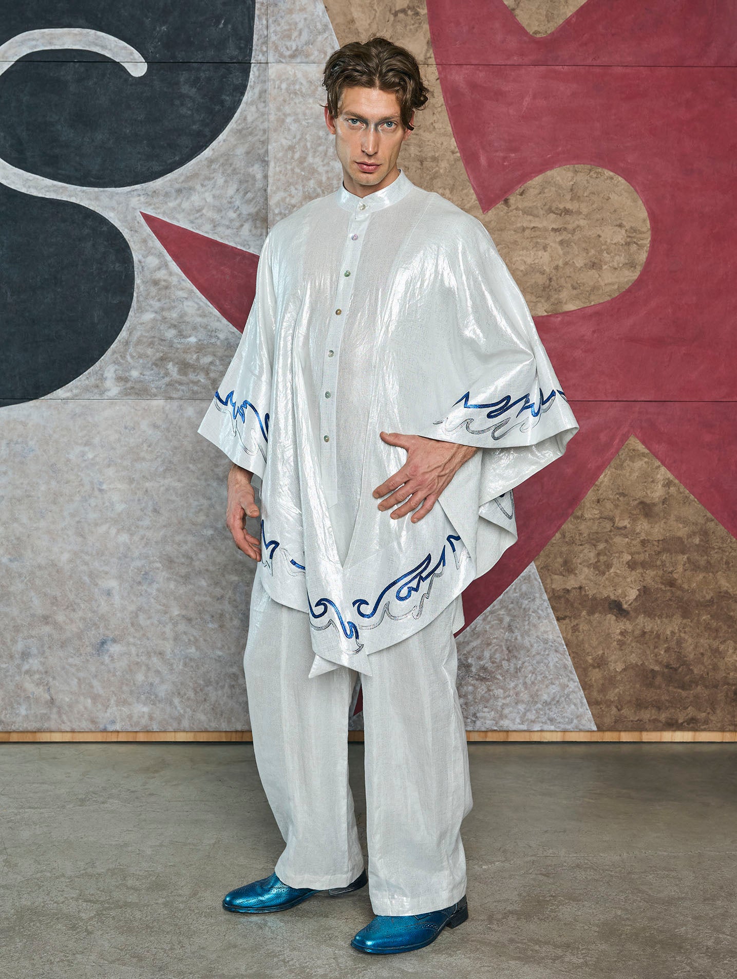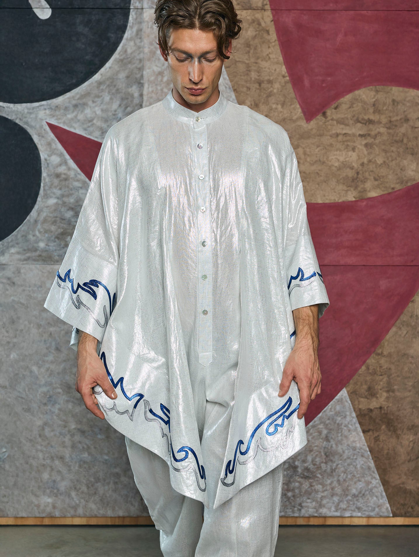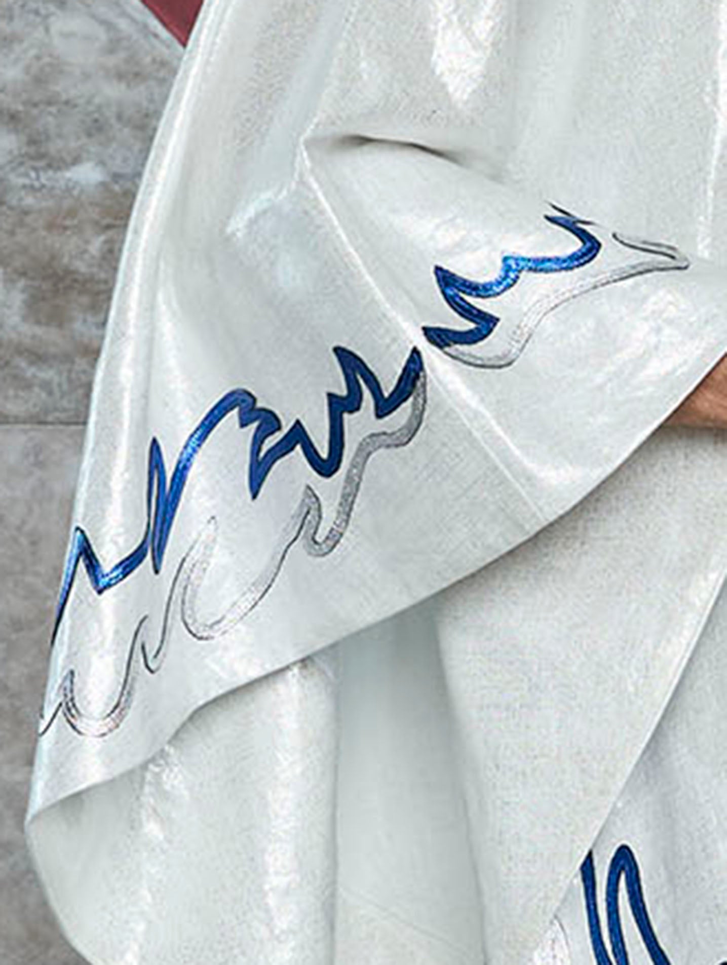 Elegant jumper with an irregular drape. Designed with a mandarin collar and oversized sleeves, the garment's edges feature hand-cut leather motifs.