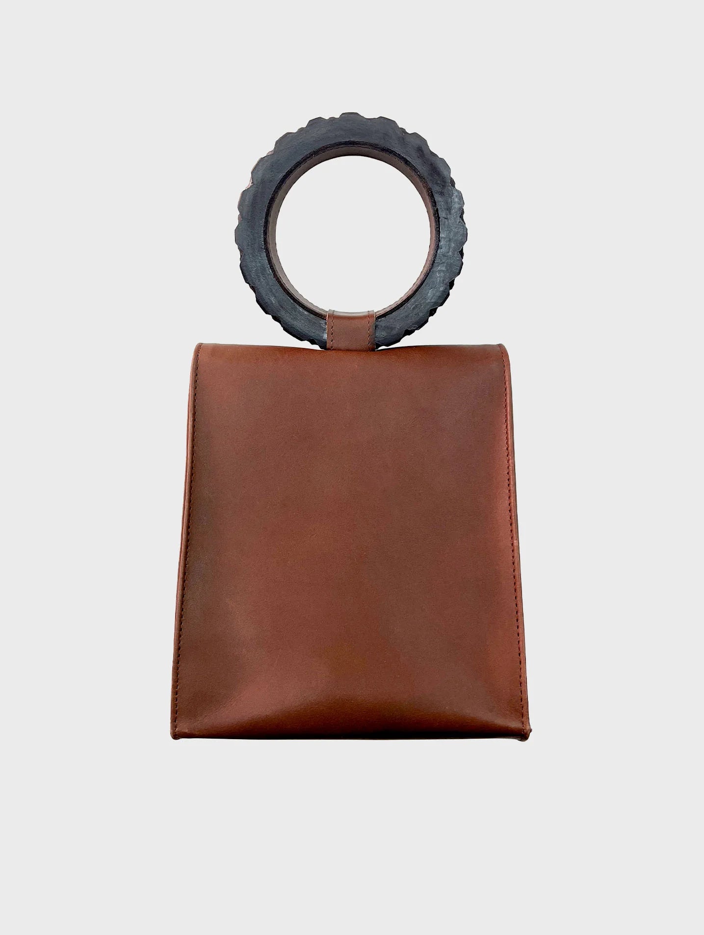 Bolso de mano de piel hecho a mano. Tiene un mango de madera hecho a mano y está diseñado con un bolsillo interior y cierre frontal a presión.