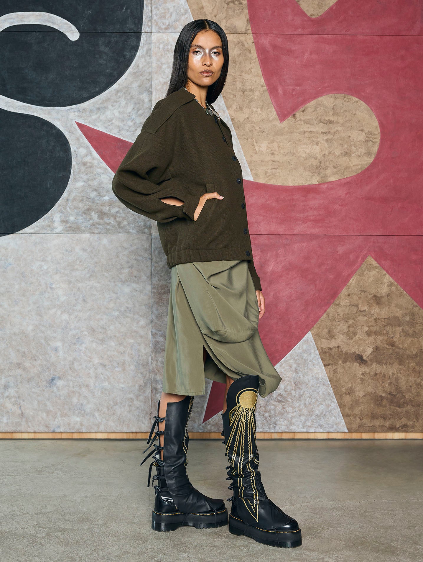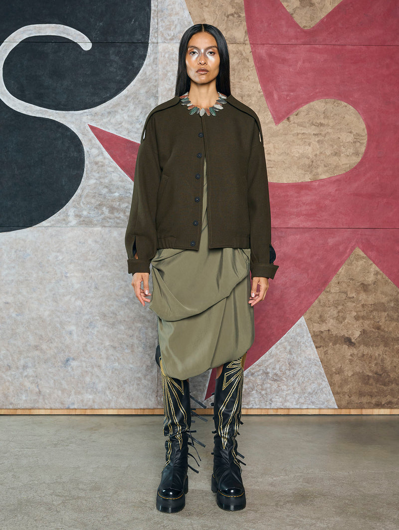 Long-sleeved, round-neck bomber jacket. In addition to elegant epaulette details on the shoulders and cuffs, the garment features a hand-embroidered Aztec sun on the back.